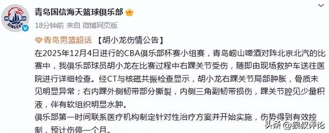 北京时间12月5日,根据青岛男篮官方社媒公示,年轻球员胡小龙右内踝外侧韧带部分撕裂 预计伤停1个月。